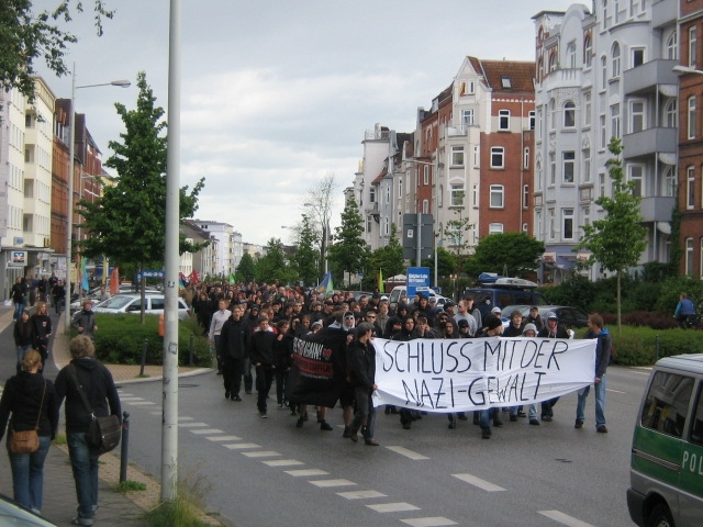 Zu glauben, es handele sich dabei um Auseinandersetzungen zwischen „linken- und rechten Chaoten“, ist falsch und verharmlost eine schleichende Entwicklung rassistisch-faschistischer Aktivitäten in dieser Stadt. Diese Gewalt durch die Nazis und ihre zunehmende und dauerhafte Präsenz u.a. durch Flugblattverteilungen in der Kieler Innenstadt geht uns alle an. Diese Leute bedrängen Menschen aufgrund ihres Äußeren, ihrer Herkunft, ihrer Denkoder Lebensweise. Sie haben allen alternativen, bunten und pluralistischen Menschen in dieser Stadt den Krieg erklärt. Nazi-Gewalt geht uns alle an!